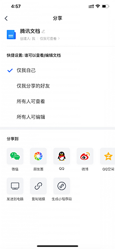 - 允许多人同时在线编辑同一文档,并能查看历史编辑记录;生成的文档链接可以分享到QQ、TIM、微信、微博及朋友圈。