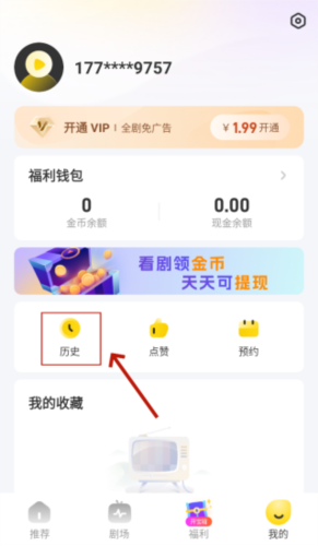 2、如需删除记录,请先完成手机号登录;随后点击“历史”进入观看历史页面。