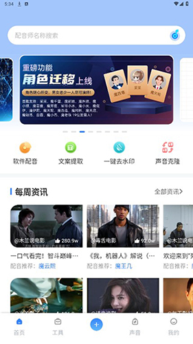 点击底部“首页”标签,可使用配音、文案提取、视频去水印、声音克隆等功能,也能浏览平台推荐的趣味配音视频。