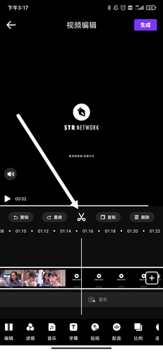 首先打开应用,选择目标视频进入编辑界面;拖动时间轴至需要分割的位置,点击工具栏上的剪刀图标进行分割。