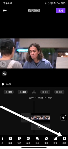启动软件并导入视频,在编辑界面下方找到并点击【水印】功能选项。