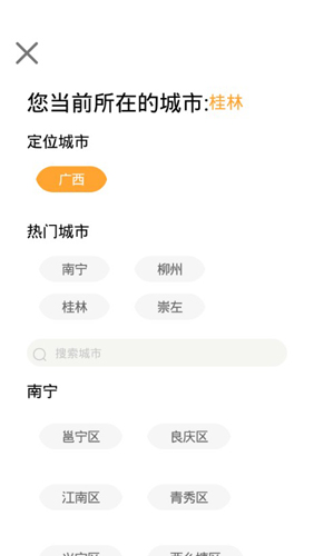 2、手动输入城市名称搜索或允许系统重新定位,选择正确城市即可。