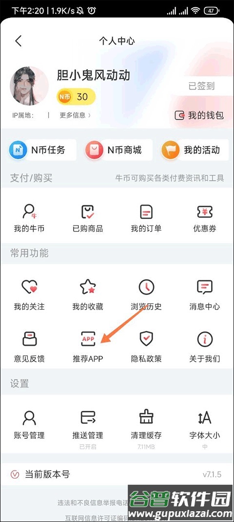 2、在个人中心页面找到“推荐应用”选项并点击进入。
