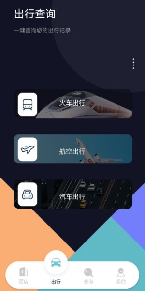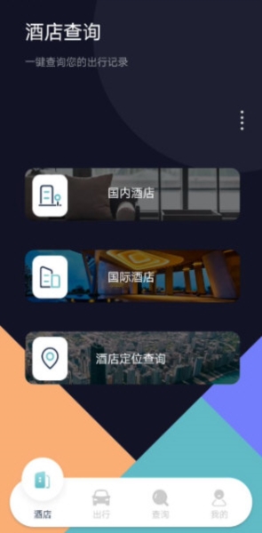 保存信息后,点击下方查询选项,选择酒店或出行类别,输入姓名或关键词进行检索。
