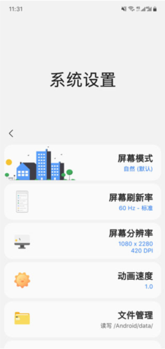 3、系统设置调整:管理屏幕模式、分辨率、DPI、刷新率、动画速度,需通过ADB、Shizuku或ROOT授权;支持系统文件管理、界面调节、网络模式与频段选择;