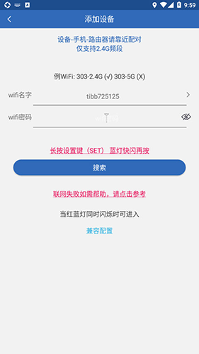 4、根据实际情况选择,例如选择WiFi配置,则输入当前可用的WiFi名称与密码,点击搜索按钮即可开始添加设备。