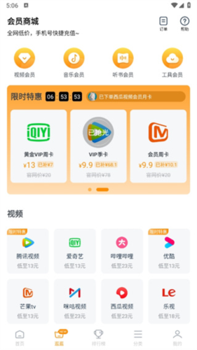 2、逛逛页面提供视频会员、音乐会员、听书会员及工具会员等多种服务购买选项;
