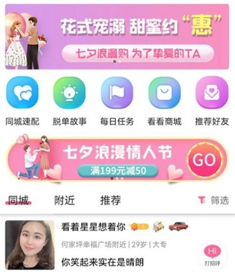 1、同城附近:基于精准定位,主动为您推荐附近的活跃用户,方便发起即时交流。