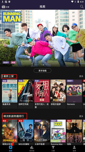 1、推荐板块包含最新上架内容、韩流影剧热播排行;