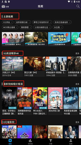 2、设有主题推荐、5G高速畅享4K、最新影院看好看满、0元电影院等精彩栏目;