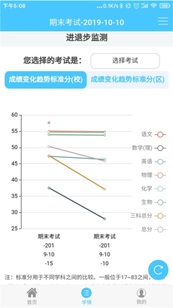 4、登录成功后,点击底部学情菜单,即可查看各科目成绩详情。