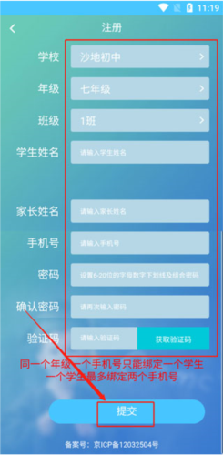 3、新用户注册需填写学生信息与家长信息,获取并输入验证码后提交即可完成注册。