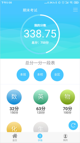 6、登录后,点击底部学情菜单,即可查看各科目成绩,示例见下图。