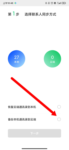 界面会显示两个选项,用户可选择备份本机通讯录至云端,也可直接点击下一步;
