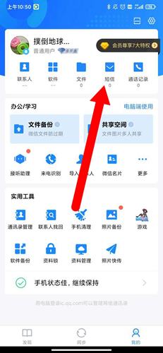 打开应用,进入“我的”页面,此处可管理云端备份数据,找到“短信”选项并点击进入;