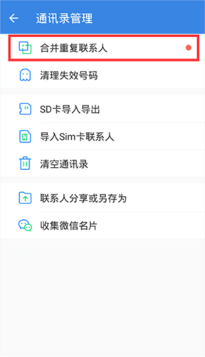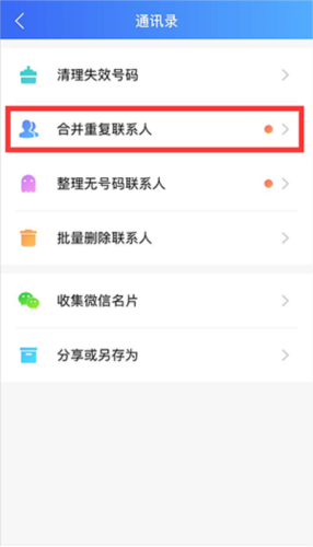 在“我的”页面中找到“通讯录”选项,使用其中的“合并重复联系人”功能,按指引操作即可。
