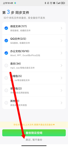 接着选择需要同步到云端备份的具体文件类型,选择完成后点击“备份到云空间”,即可完成备份操作。