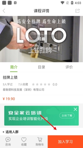 3、进入课程详情页,标有价格的课程需购买,未标价课程一般为免费资源,确认后点击“加入学习”;