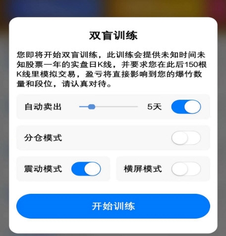 为适应不同操作偏好,应用提供双盲训练、涨停训练与指数训练三大模块;同时支持自动卖出、分仓模式、震动模式等多种设置,力求还原真实交易习惯。