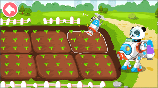 2、进入菜地场景,移动画面中的花洒为植物浇水,帮助它们生长。