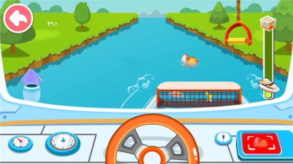 2、孩子将操控一艘清洁艇,需要根据垃圾漂浮的方向来调整方向盘,让船头的网兜成功捕获垃圾。