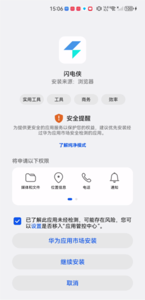 3、然后,勾选“已了解此应用未经检测……”的提示框,再点击“继续安装”,遇到安全提醒属正常情况。