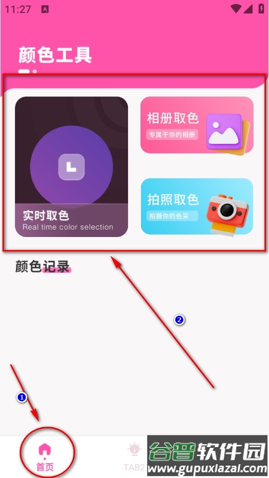 1、下载并打开应用,在首页顶部选择所需的颜色提取类型;