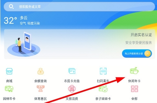1、在应用首页,点击上方功能区的“休闲年卡”入口。