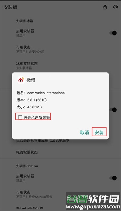 安装狮-自定义模块允许指定包名或活动名作为安装接口,向目标应用发送安装请求。