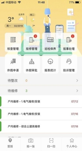 应用内的核查管理模块能自动生成待办事项,支持快速完成或提交整改,并允许按时间查看任务状态。报事处理模块让工作人员能即时响应业主提交的问题,加快处理进程。休假申请与审批流程也经过简化,可通过手机直接提交与批复,方便团队协作。