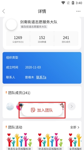 2、进入“文明实践”页面,点击“加入我们”,查看当前招募的志愿团队列表。