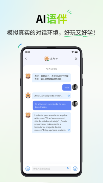 AI语伴功能:模拟真实对话场景,让用户在实践中练习口语,无需担心语法或词汇量的限制。