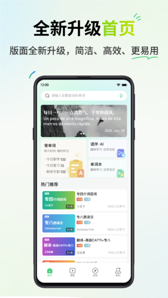 丰富的多媒体课程:包含大量免费零基础课程、外刊与影剧资源,同时提供DELE、专四、专八等考试辅导课程。