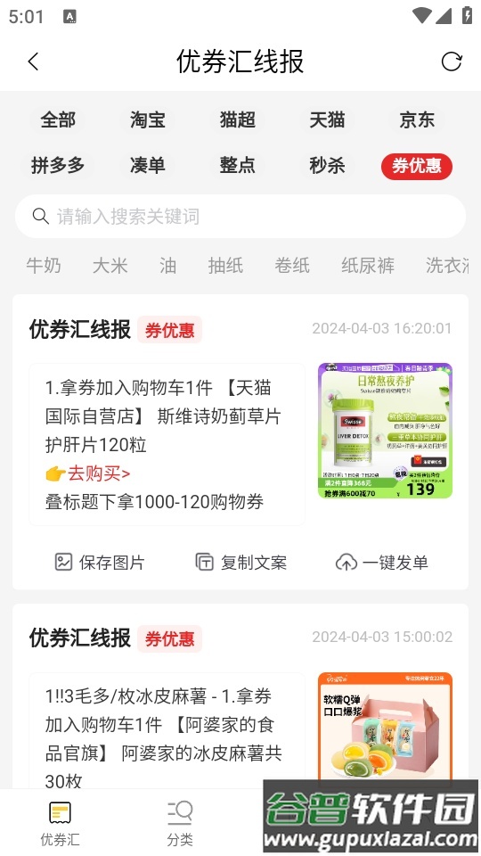 1、在app中浏览各个品类的商品与优惠券,包括服装、美妆、家居、数码等;根据自身需要选择对应类别。
