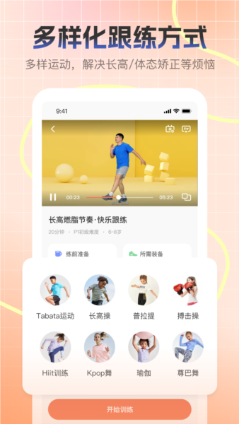 根据孩子的身高发育水平、运动基础及所处年龄阶段,定制专属长高运动计划;提供适配不同基础的阶梯式课程,帮助突破长高瓶颈;计划支持无器械训练,随时随地进行练习。