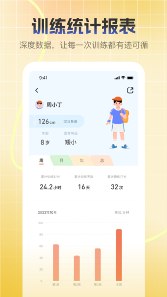 2、跟踪记录运动成效,实时分析用户发育状态,辅助调整优化训练计划。