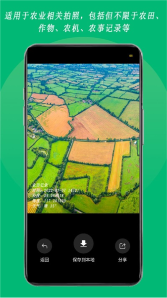 2、精准的定位与时间:采用智能定位技术,位置信息精确细致,配合自动更新的时间系统,确保每张照片都附带准确的工作数据,助力田间高效办公。