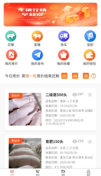 平台支持在线竞拍功能,用户发现合适猪源后可立即出价竞购;