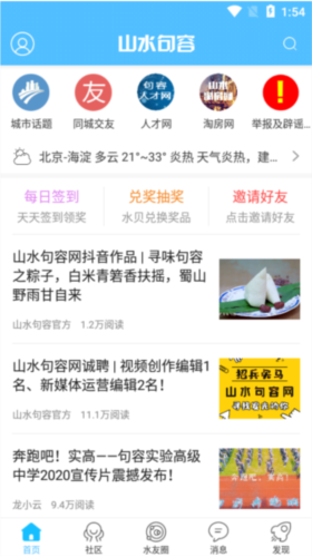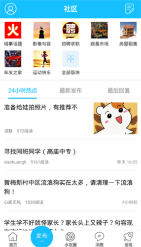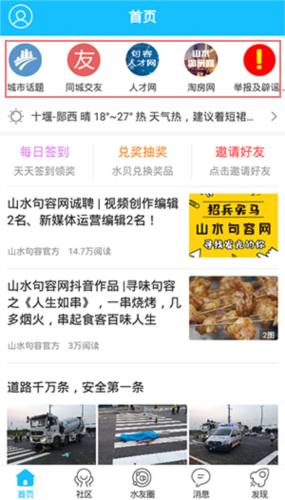 3、社区板块下设招聘求职、房屋租售、车友交流、运动健身等分类,同时提供本地资讯阅读;