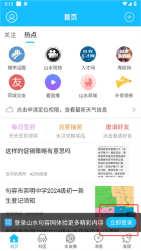 1、打开山水句容网APP,进入首页后点击右下角的【立即登录】按钮;