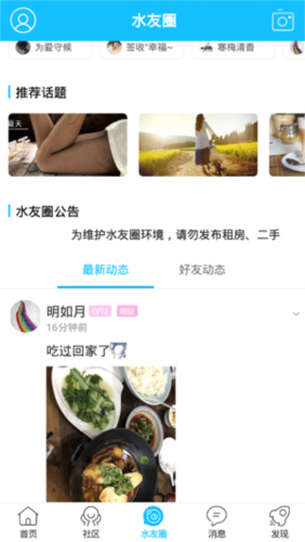 4、水友圈以社交动态为主,设有交友、话题、附近等功能,可浏览其他用户发布的即时动态;