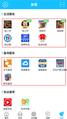 5、发现板块整合了多种生活服务工具,例如找工作、查天气、查快递和违章查询等。