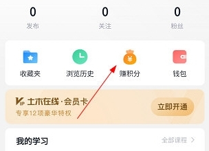1、进入APP个人中心页面,点击“赚积分”入口;