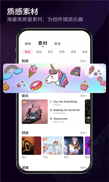 拥有大量特效资源,简单点击就能为视频添加动态效果,增加趣味性与吸引力。