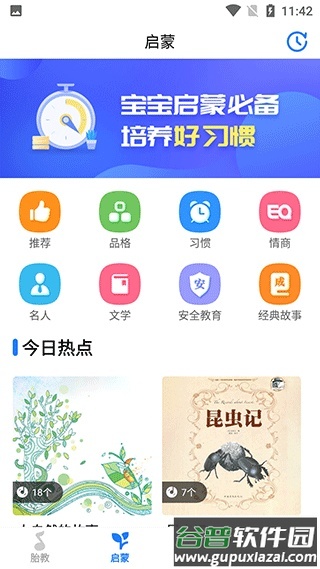 2、进入启蒙板块,可以找到文学故事、名人轶事、品格教育等丰富内容;