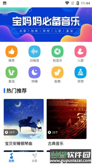 1、安装并启动软件后,首页会展示白噪音、轻音乐、儿歌等多种分类供你挑选;