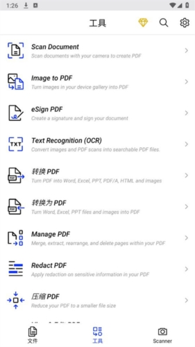 ◦ 提供快速的PDF浏览体验,支持文本搜索、高级缩放、单页或连续滚动等多种模式;
