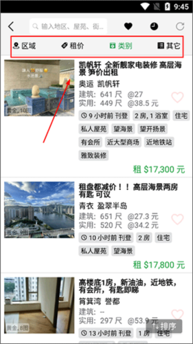 4、进入【住宅】页面后,可按地区、价格、房屋类别等条件筛选,寻找合适住房;