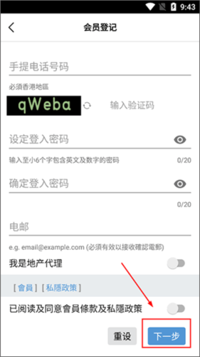 2、在【会员登记】页面填写相关信息完成注册;注:需使用香港地区电话号码方可成功注册;