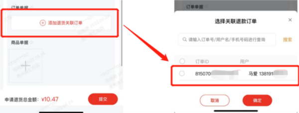 注:添加退货关联订单功能目前主要应用于电商商品退货,相当于顾客线上退款成功的凭证。关联后,审核环节可直接查看对应订单,门店无需再单独提交退款截图,操作更为简便。